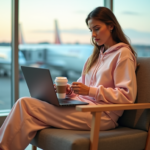Cozy home scene with brown boots, steaming coffee cup, and knitted throw by a sofa.